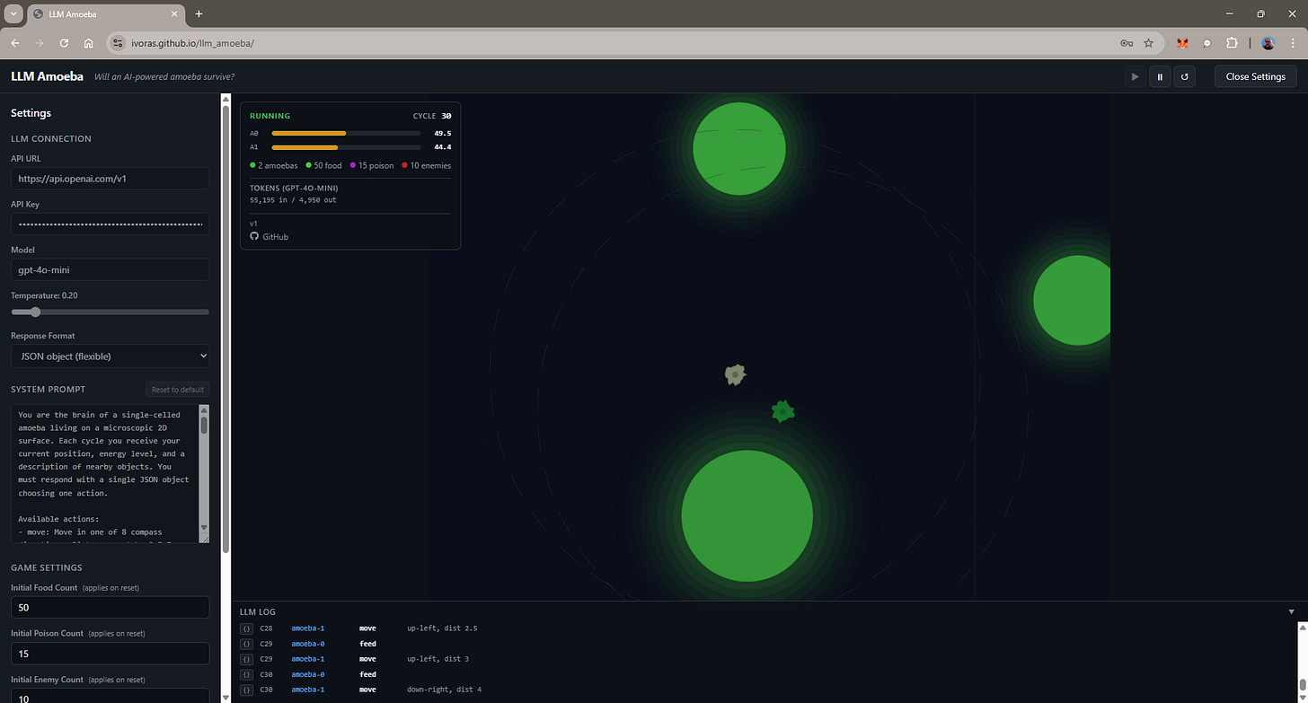 It’s surprising how often LLMs just get stuck in a loop, moving an amoeba back and forth, until it dies of starvation. Similarly, sometimes the LLMs just give dumb instructions, like moving away from the food. Try to fix that in the system prompt!